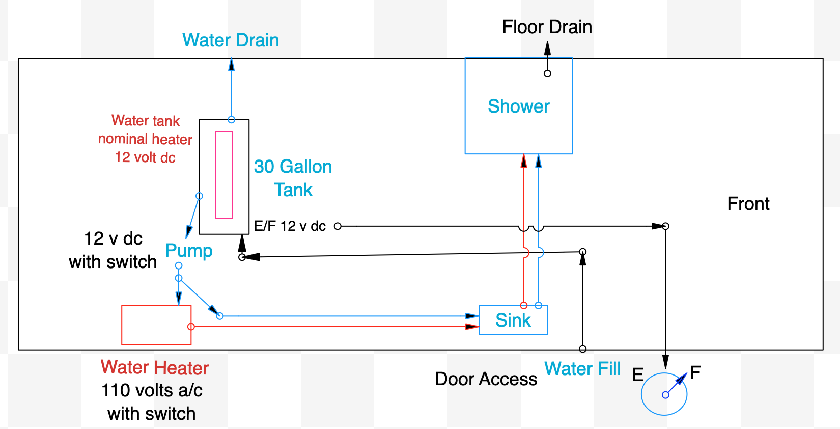 - Hot water heater, 110 volts ac + switch